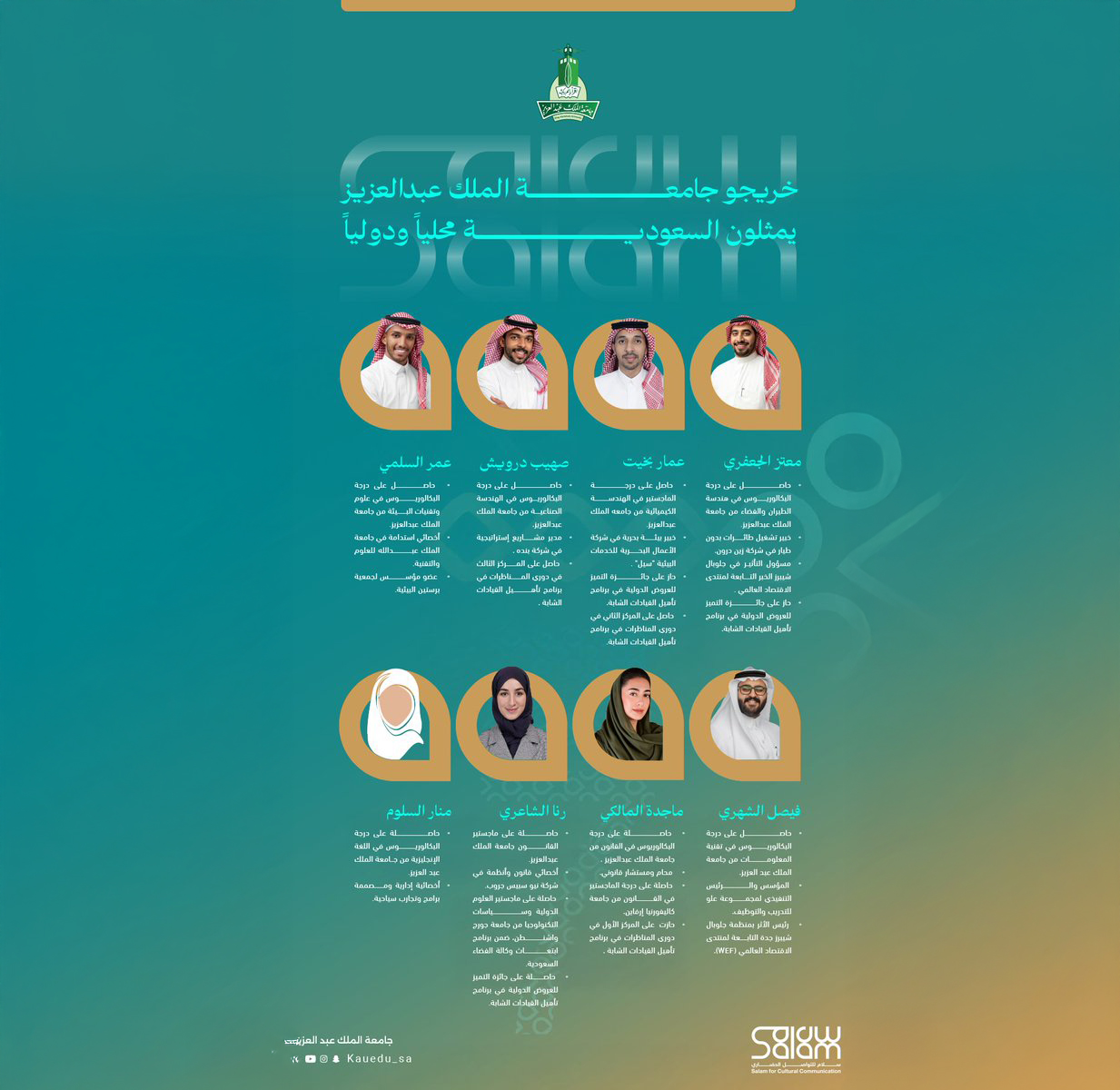 تسعى جامعة الملك عبدالعزيز لتوفير بيئة أكاديمية وبحثية متميزة تسهم في بناء أجيال قادرة على مواجهة التحديات وقيادة المستقبل. من خلال برامج تعليمية متطورة وشراكات عالمية، نعمل على تعزيز الابتكار وتطوير البحث العلمي لخدمة المجتمع والوطن.